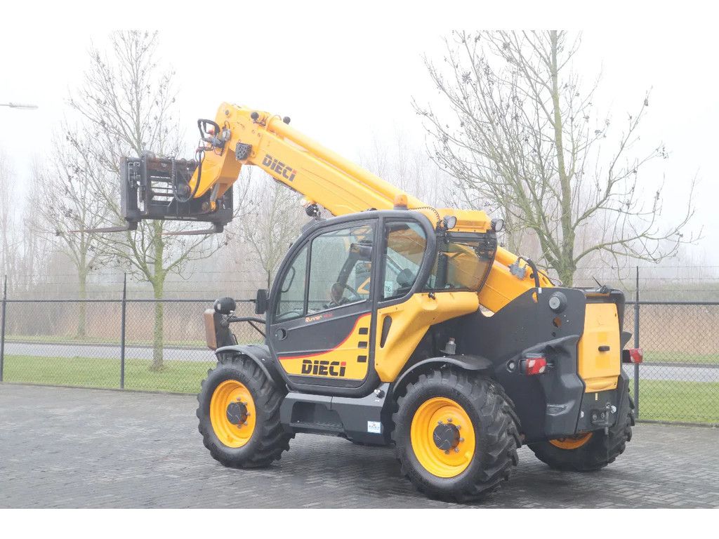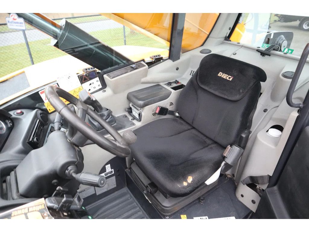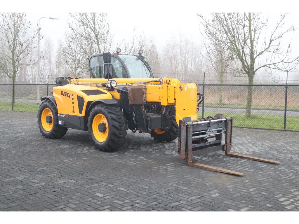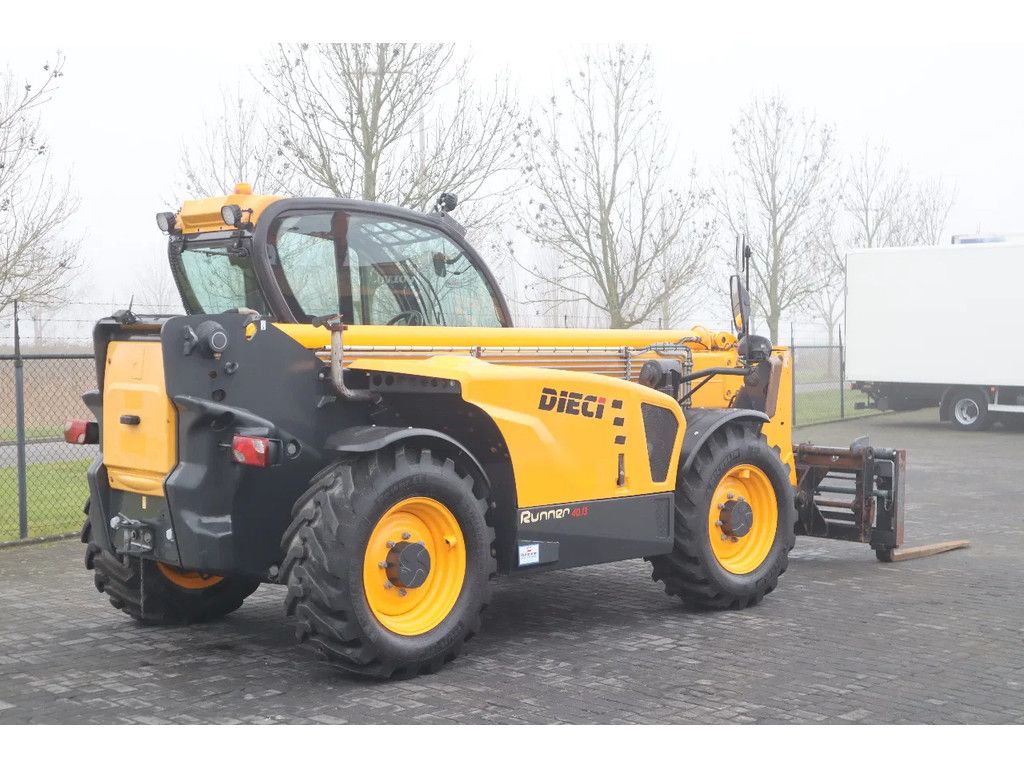 Dieci runner 40.13 Year: 2018 Hours: 2.914 Weight: 10.350 kg Engine: Kubota V3800 CRTI EF02 Turbo diesel No. cylinders: 4 Displacement: 3.800 cc Emissions: Stage 4 Power: 83 kW / 113 HP Ad blue EPA Transmission: 2 speed hydrostatic 4X4 Max speed: 32 km/h Performance: Max Lifting Capacity: 4.000 kg Max Lifting Height: 12.4 m Tires: 400/70R24 70% – 70% Transport dimensions: Length: 5.7 m Width: 2.4 m Height: 2.5 m General specifications: Forks 1.2 m Side shift Fork positioners Fops / Rops Trailer hitch Boom side shift (sway) Extra hydraulic functions All Wheel steering 3 way 2-pointed outriggers Auto leveling LED working lights Radio 2x camera’s Load capacity chart Attachments: Hydraulic fork carriage, length 1.20 cm